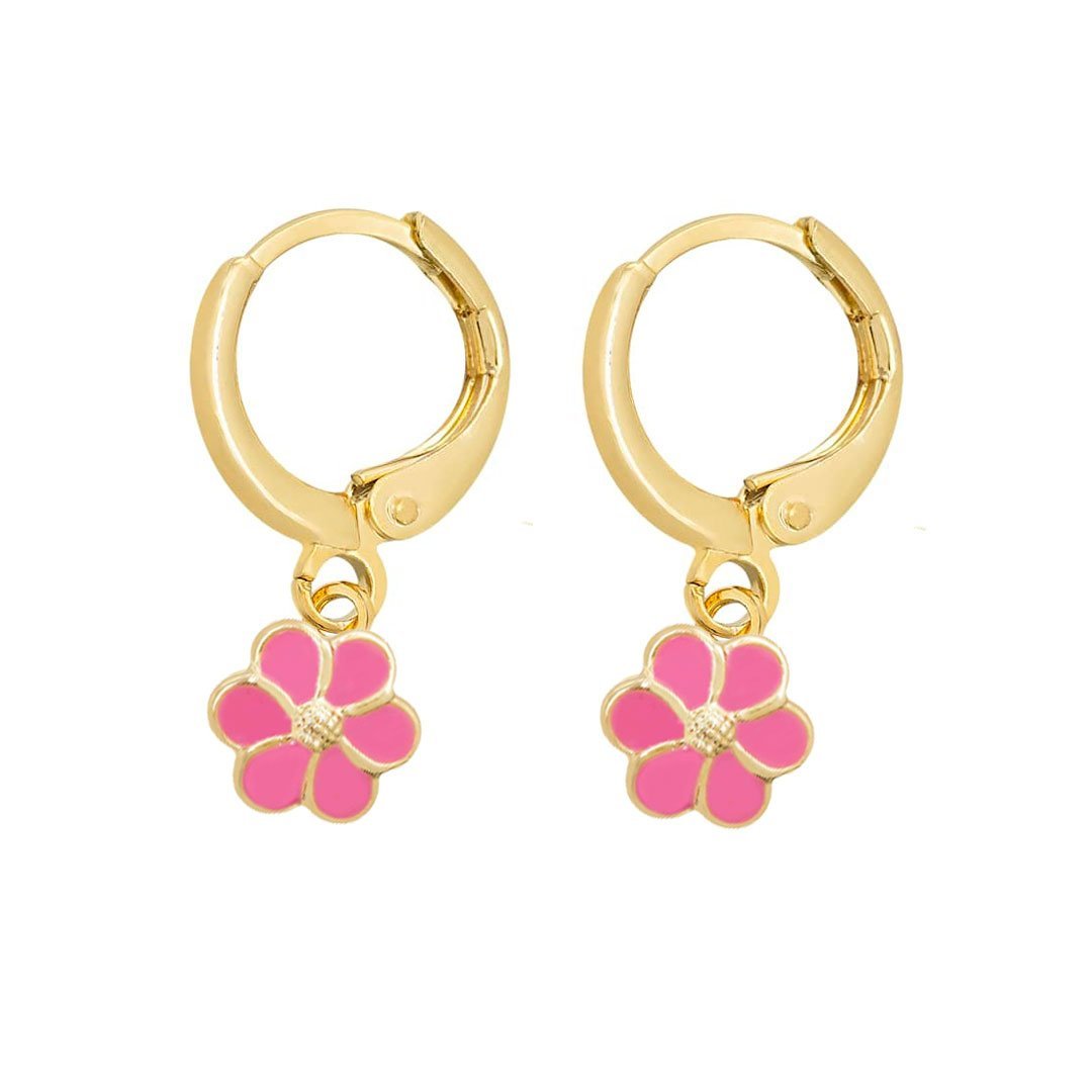 Brinco Argolinha Infantil de Florzinha resinada podendo variar entre rosa e vermelho. Semijoia banhada á ouro 18k revestida com uma camada exclusiva de verniz antialérgico.