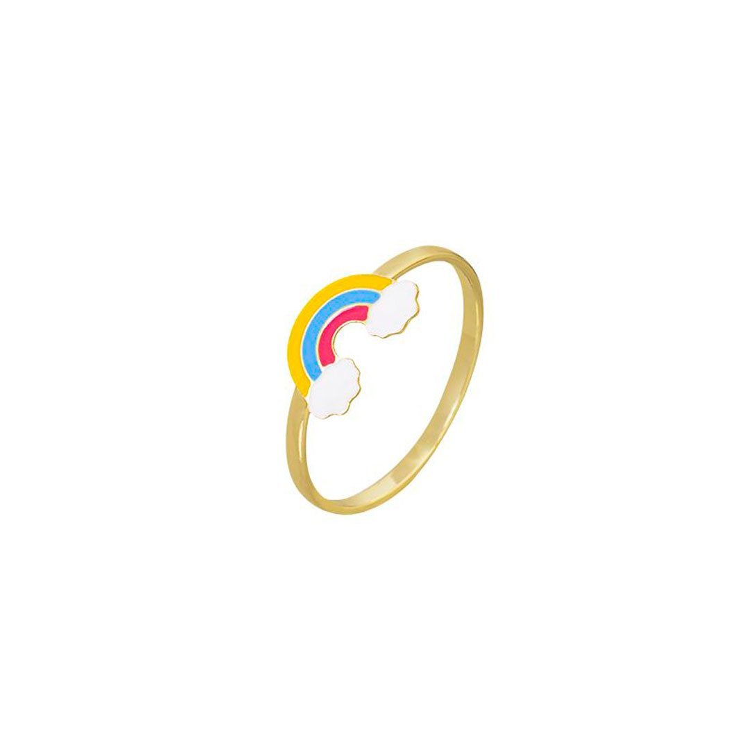 Anel infantil de Arco Íris colorido resinado em amarelo, azul, vermelho e nuvens brancas. Contém formato lúdico e divertido. Semijoia banhada á ouro 18k revestida com uma camada exclusiva de verniz antialérgico.