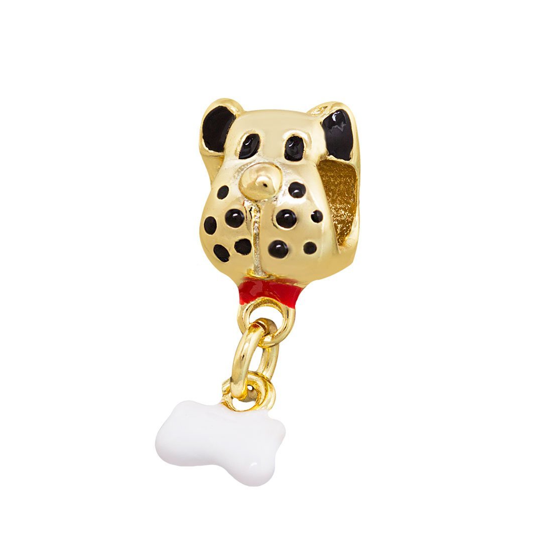 Berloque com passante de cachorrinho resinado e um ossinho pendurado para pulseira de berloques. Semijoia banhada á ouro 18k revestida com uma camada exclusiva de verniz antialérgico.