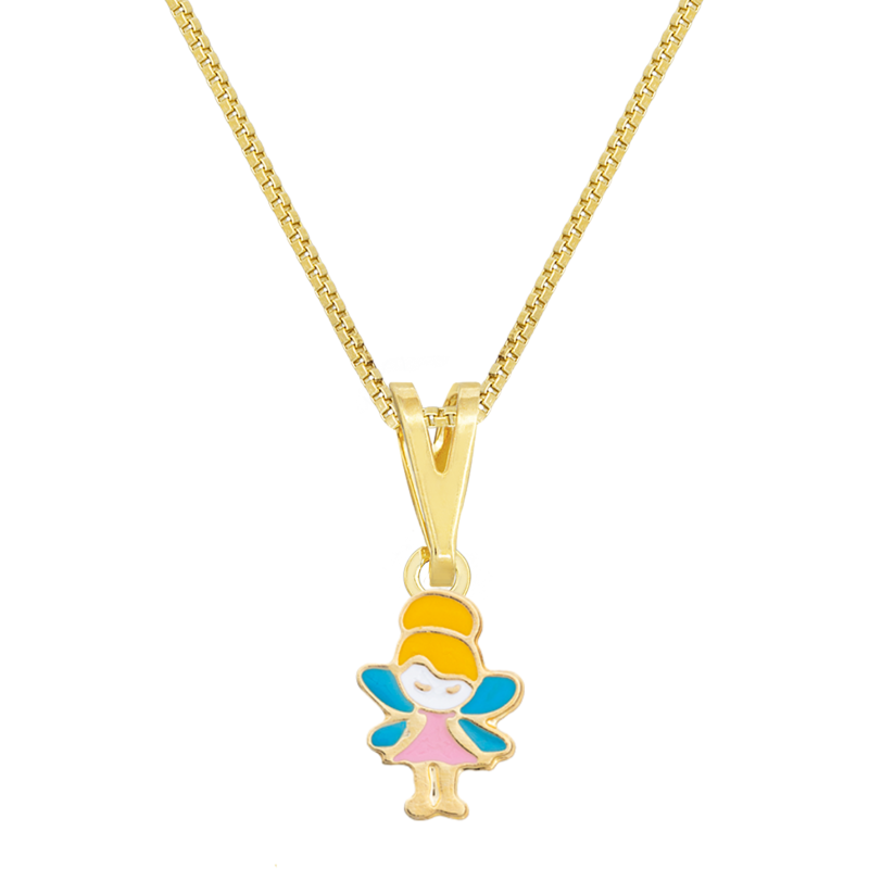 Colar Infantil Fadinha resinada colorida, seu formato é lúdico e divertido. Semijoia banhada á ouro 18k revestida com uma camada exclusiva de verniz antialérgico.