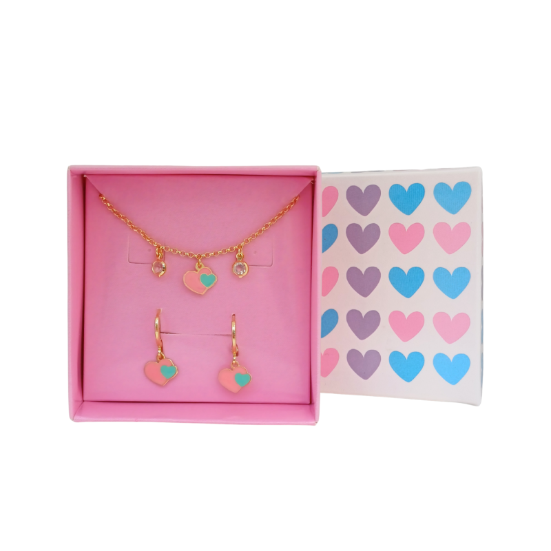 Conjunto Infantil Brinco Argolinha e Pulseira Dois Corações Banhado em Ouro! Proporcione momentos mágicos com este conjunto encantador! Elegância e carinho se unem em semijoias hipoalergênicas, criadas para encantar e proteger as pequenas com segurança e conforto. O brinco de argolinha traz dois corações resinados em tons suaves de rosa e verde, enquanto a pulseira exibe um delicado pingente resinado com detalhes de pedrinhas em cristal ou rosa, adicionando brilho e charme ao design. Cada conjunto acompanha uma embalagem exclusiva, decorada com corações em tons delicados de rosa, lilás e azul, transformando o presente em uma experiência memorável. Com acabamento em verniz para maior durabilidade e 1 ano de garantia, este kit é a escolha perfeita para presentear ou revender, celebrando conquistas, momentos especiais ou simplesmente surpreendendo com muito amor. Um presente delicado, seguro e cheio de estilo, pensado especialmente para meninas delicadas e cheias de encanto.