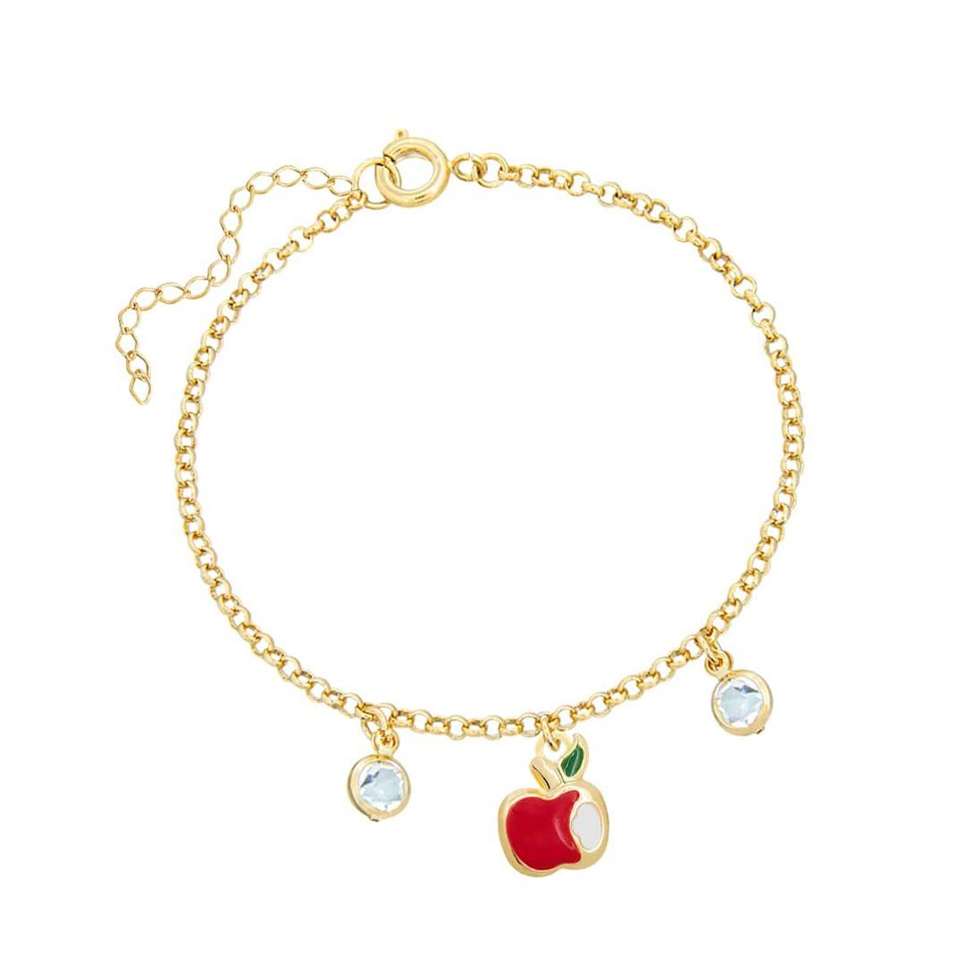 Pulseira infantil de Maçã resinada com duas pedrinhas nas laterais podendo variar entre cristal e vermelho. Semijoia banhada á ouro 18k revestida com uma camada exclusiva de verniz antialérgico.