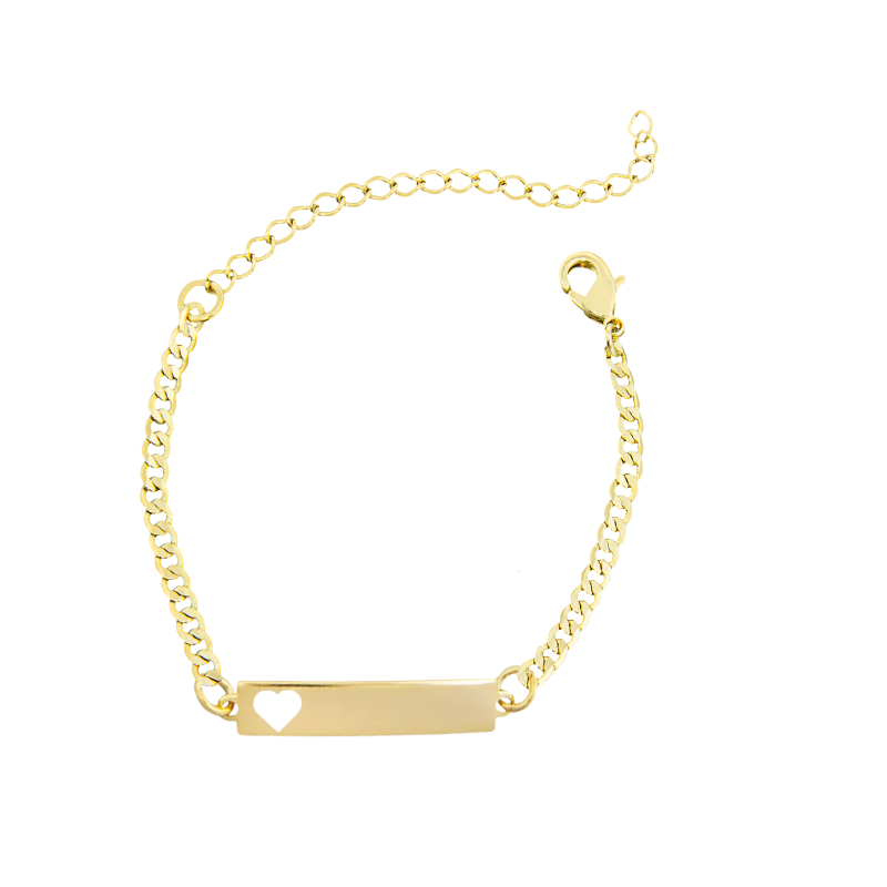 Pulseira infantil plaquinha lisa com Coração vazado. Semijoia banhada á ouro 18k revestida com uma camada exclusiva de verniz antialérgico.